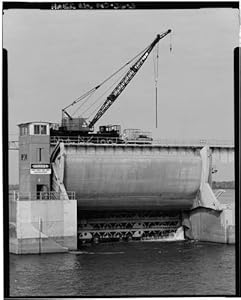 Product Description : Size: 8 x 10 Print5. VIEW OF DAM, SHOWING TAINTER GATE NO. 1 IN RAISED POSITION, EMERGENCY BULKHEADS, SERVICE BRIDGE, AND LOCOMOTIVE CRANE, LOOKING NORTH (UPSTREAM) - Upper Mississippi River Nine-Foot Channel Project, Lock & Dam No. 24, Clarksville, Pike County, MO