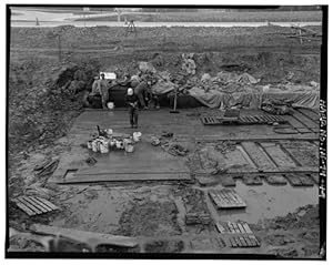Product Description : Size: 8 x 10 Print49. View looking northwest, toward U.S. 24. Removal of west forebay decking. The technician in the right rear is operating a device used for pulling the spikes - an auto jack, chain and a pair of adapted 'vice grip' pliers welded to the chain. This photograph shows the 1 inch boards (in center right) which were laid atop the foundation timbers to locate the cribs for the workers. In addition, the flooring in the first crib is visible (center) This was the only crib which was floored, the other cribs were built directly above foundation timbers (center right). - Wabash & Erie Canal, Lock No. 2, 8 miles east of Fort Wayne, adjacent to U.S. Route 24, New Haven, Allen County, IN