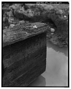Product Description : Size: 8 x 10 Matted56. View looking east. Detail showing an end of three crib side walls, being flown by the derrick. The upper part of the fourth member, marked with an identifying tag, shows evidence of burning. Notice how well the lower members fit together. This view shows that individual timber members were worked, in part, after assembly. - Wabash & Erie Canal, Lock No. 2, 8 miles east of Fort Wayne, adjacent to U.S. Route 24, New Haven, Allen County, IN